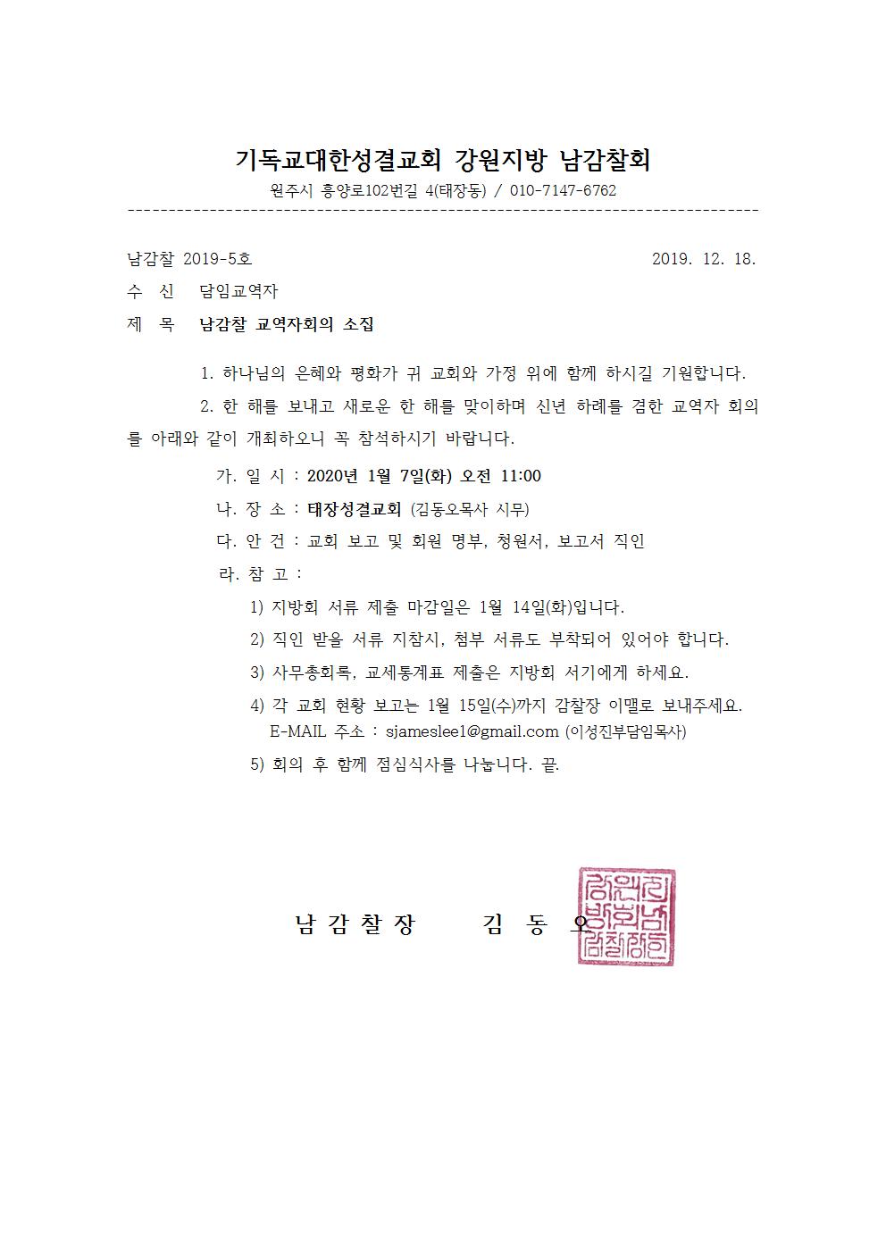남감찰회 교역자회의 공지 - 2020년01월07일